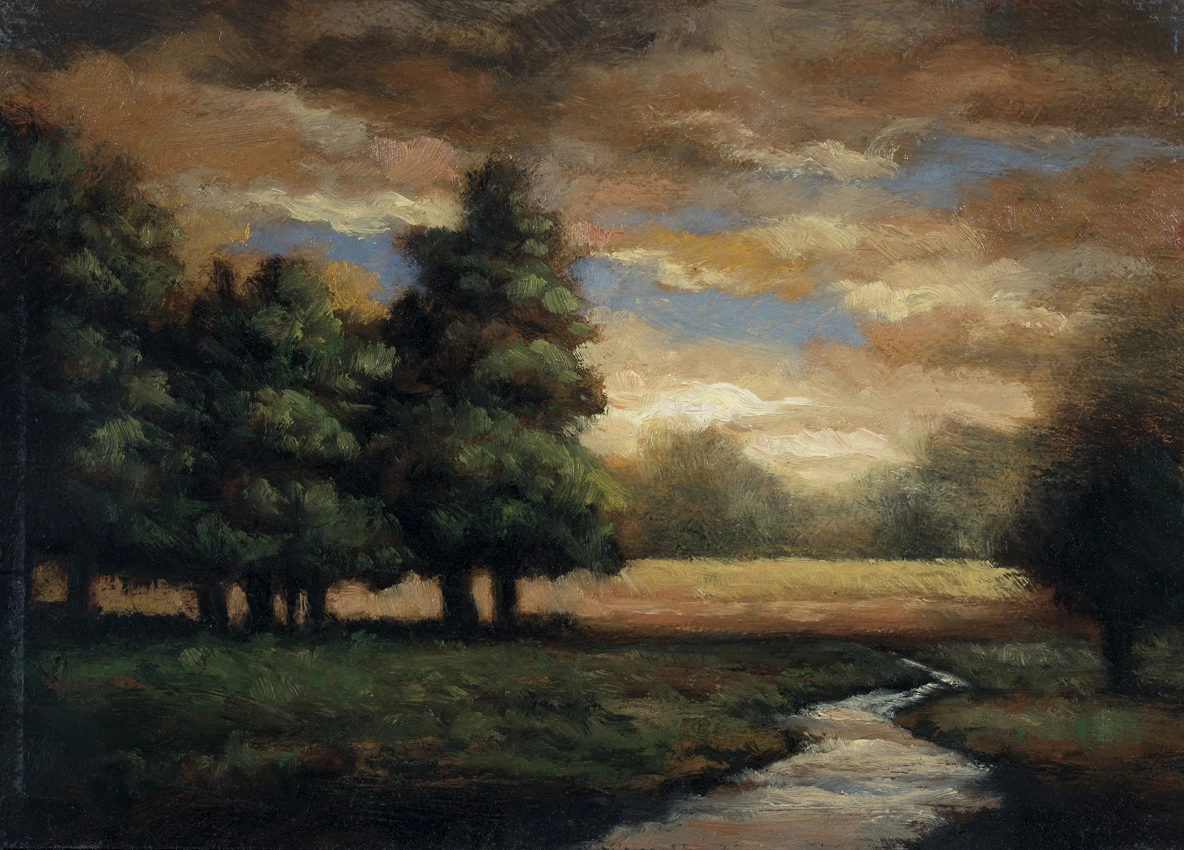 It's late afternoon, the sun is warm as a gentle stream is meandering through the field. The gold, red and pink hues of the sky, the moss green of the trees and the burnished glow of the drying grass, bring's a warm glow to this scene.