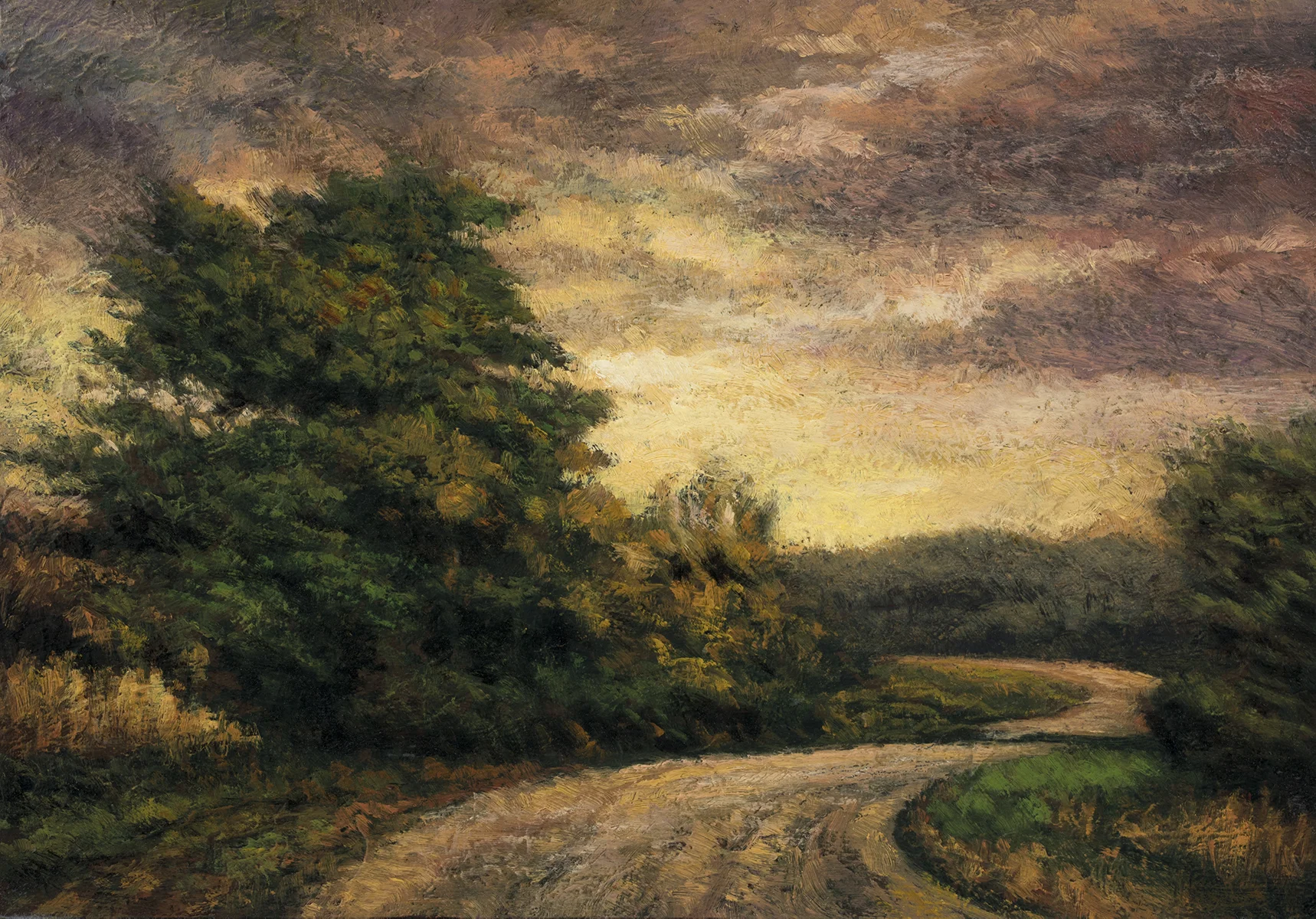 A country road winds around the bend on a late afternoon. Coral, orange, smokey greys and earthy greens color the scene.